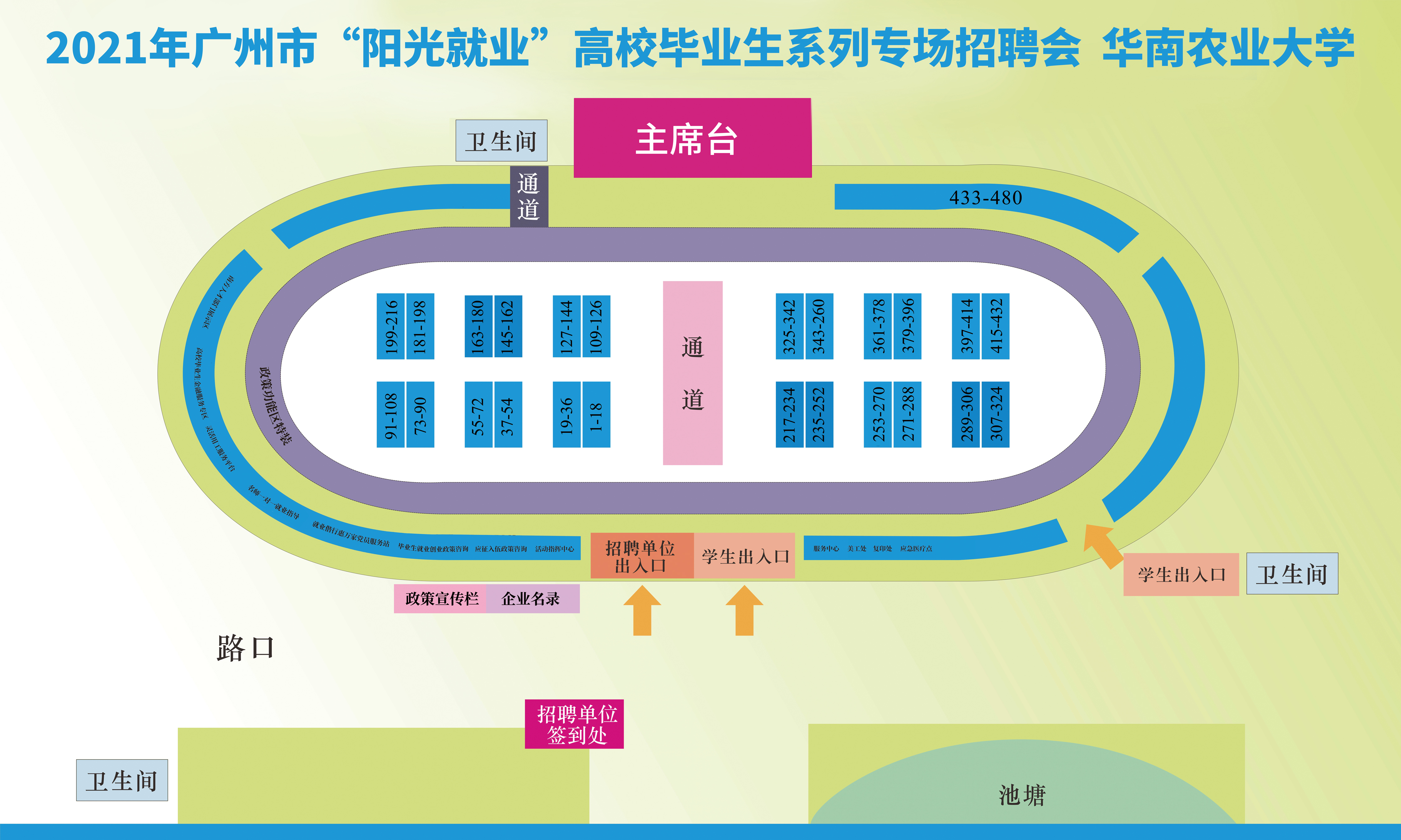 参会企业工作人员:统一从我校西南门进校,出示参会证或确认函、实时更新的粤康码或穗康码(绿码),并接受体温检测,确认信息后方可进校。进校后,沿路标指引到达华山运动场,签到入场。