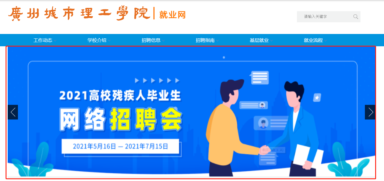 1. 学生可进入我校就业网(https://jyw.gcu.edu.cn/),在首页banner位点击活动图片(如下图所示),直接跳转至活动专题页面。