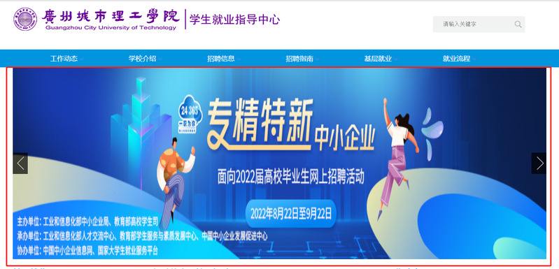 (一)学生可进入我校就业网(https://jyw.gcu.edu.cn/),在首页banner位点击活动图片(如下图所示),直接跳转至活动专题页面。